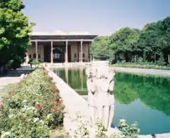Le palais est situé au milieu d'un jardin qui faisait à l'origine 7 hectares, situé entre la meydān-e shāh (place Naghsh-e Jahan) et le chāhār bāgh. À l'est s'étend un long et étroit bassin rectangulaire (115 × 16 mètres environ), dans lequel il se reflète. Les quatre statues de jeunes filles avec des lions qui ornent actuellement ses coins étaient à l'origine dans un autre palais du début du XIXe siècle, le Khalvat-e Sar Pushide, qui n'existe plus aujourd'hui. D'après Kaempfer[4], il existait auparavant un bassin sur le côté ouest, pour que le bâtiment et le jardin forment une seule unité continue.