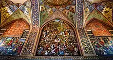 Sur les murs est et ouest, les niches supérieures sont entièrement remplies par deux peintures murales datant des Qajars: la victoire de Nāder Shāh sur l'empereur moghol Muhammad Shâh à l'est, et à l'ouest la bataille de Chaldoran qui vit la défaite du fondateur de la dynastie séfévide, Shāh Ismail, face aux Ottomans de Sélim Ier équipés de canons, défaite ressentie paradoxalement comme "l'acte fondateur d'une nation résistant à l'envahisseur" (Yves Bomati)[6]. Une bande de décorations sépare la peinture de la zone située en dessous. Cette zone est remplie de scène plus petites, avec peu de personnages.