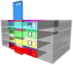 Le bâtiment utilise cinq cheminées comme système de ventilation et de rafraîchissement. Les principaux composants de ces cheminées sont leur partie orientée au sud (dans l'hémisphère nord) d'une surcouche en verre, d'une paroi à forte capacité thermique du côté opposé et passant entre les deux d'une évacuation en acier inoxydable s'élevant quelques mètres au-dessus du niveau du toit. Les cheminées sont reliées aux planchers creux qui sont refroidis pendant la nuit. Les tubes intégrés aux planchers peuvent produire davantage de fraîcheur en utilisant un puits provençal.