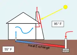 Une ventilation naturelle peut être créée en mettant des bouches d'aération dans les étages supérieurs d'un bâtiment pour permettre à l'air chaud de s'élever par convection et de sortir. En même temps, de l'air plus frais peut être introduit provenant d'autres bouches aux étages inférieurs. Des arbres peuvent être plantés de ce côté du bâtiment pour que l'ombre rafraichisse l'air entrant extérieur.