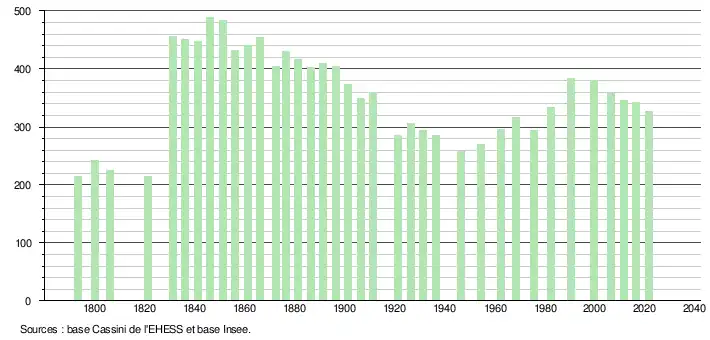 L'évolution du nombre d'habitants est connue à travers les recensements de la population effectués dans la commune depuis 1793. Pour les communes de moins de 10 000 habitants, une enquête de recensement portant sur toute la population est réalisée tous les cinq ans, les populations légales des années intermédiaires étant quant à elles estimées par interpolation ou extrapolation[15]. Pour la commune, le premier recensement exhaustif entrant dans le cadre du nouveau dispositif a été réalisé en 2006[16].