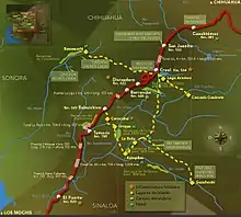 - (es) Cet article est partiellement ou en totalité issu de l’article de Wikipédia en espagnol intitulé « Ferrocarril Chihuahua al Pacífico » (voir la liste des auteurs).
