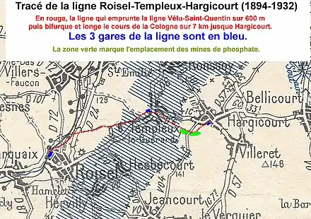 Elle débutait en gare de Roisel, se séparait de la ligne d'intérêt local de la ligne d'intérêt local de Vélu-Bertincourt au PK 0,450, puis atteignait la gare de Templeux-le-Guérard au PK 4,275. La ligne se poursuivait jusqu'à la gare de Hargicourt (PK 6,850), jusqu'à son extrémité au PK 7,9[1]