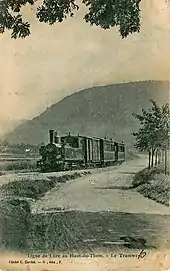 Un train tracté par la locomotive n°4 en gare du Haut-du-Them, peu après la mise en service de la ligne, en 1903