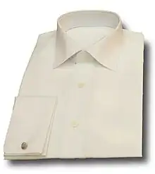 La chemise requise pour la queue-de-pie est très spécifique. Il doit avoir un col d'aile détachable et être fixé avec des boutons de chemise au lieu de boutons sur le devant. Les crampons sont normalement en nacre sertie d'or ou d'argent, mais une incrustation d'onyx noir est également autorisée. Les boutons de manchette doivent correspondre aux goujons. Le devant de la chemise est composé de panneaux fabriqués dans un matériau différent du reste de la chemise, qui sont les seules parties visibles sous le gilet. La forme des panneaux, un de chaque côté, est soit rectangulaire, soit en forme de U plus ancienne (conçue pour s'asseoir sous les gilets en forme de U des années 1920, maintenant largement remplacés par la forme en V plus moderne). Le matériau des panneaux est constitué soit de couches de coton épais épais et fortement amidonnées (ce type est souvent appelé une chemise bouillie sur le devant car il faut la mettre dans de l'eau bouillante pour éliminer l'amidon avant le nettoyage), soit du coton marcella (piqué). . Le marcella est plus courant, mais un peu moins formel, bien que toujours approprié, car il a été conçu à l’origine pour être utilisé sur des chemises de soirée, car les côtes peuvent capter plus d’amidon et créer un devant encore plus raide. Traditionnellement, on utilisait des chemises sans col avec un col à l'aile détachable et des boutons de col, mais on voyait parfois des motifs tout-en-un, bien que cela soit considéré comme incorrect et donne à beaucoup une apparence médiocre[5],[6]. Les poignets sont simples et fortement amidonnés (si le devant est en marcella, ils sont généralement assortis).