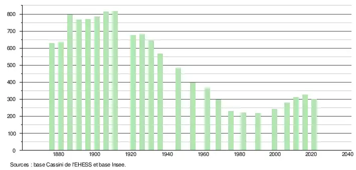 L'évolution du nombre d'habitants est connue à travers les recensements de la population effectués dans la commune depuis 1876. Pour les communes de moins de 10 000 habitants, une enquête de recensement portant sur toute la population est réalisée tous les cinq ans, les populations légales des années intermédiaires étant quant à elles estimées par interpolation ou extrapolation[18]. Pour la commune, le premier recensement exhaustif entrant dans le cadre du nouveau dispositif a été réalisé en 2006[19].
