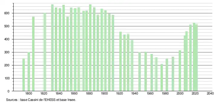 L'évolution du nombre d'habitants est connue à travers les recensements de la population effectués dans la commune depuis 1793. Pour les communes de moins de 10 000 habitants, une enquête de recensement portant sur toute la population est réalisée tous les cinq ans, les populations légales des années intermédiaires étant quant à elles estimées par interpolation ou extrapolation[16]. Pour la commune, le premier recensement exhaustif entrant dans le cadre du nouveau dispositif a été réalisé en 2008[17].