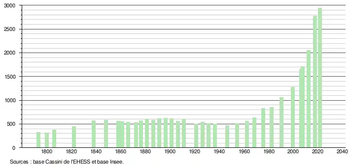 L'évolution du nombre d'habitants est connue à travers les recensements de la population effectués dans la commune depuis 1793. Pour les communes de moins de 10 000 habitants, une enquête de recensement portant sur toute la population est réalisée tous les cinq ans, les populations légales des années intermédiaires étant quant à elles estimées par interpolation ou extrapolation[21]. Pour la commune, le premier recensement exhaustif entrant dans le cadre du nouveau dispositif a été réalisé en 2007[22].