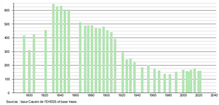 L'évolution du nombre d'habitants est connue à travers les recensements de la population effectués dans la commune depuis 1793. Pour les communes de moins de 10 000 habitants, une enquête de recensement portant sur toute la population est réalisée tous les cinq ans, les populations légales des années intermédiaires étant quant à elles estimées par interpolation ou extrapolation[17]. Pour la commune, le premier recensement exhaustif entrant dans le cadre du nouveau dispositif a été réalisé en 2004[18].