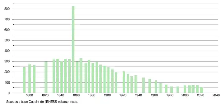 L'évolution du nombre d'habitants est connue à travers les recensements de la population effectués dans la commune depuis 1793. Pour les communes de moins de 10 000 habitants, une enquête de recensement portant sur toute la population est réalisée tous les cinq ans, les populations légales des années intermédiaires étant quant à elles estimées par interpolation ou extrapolation[17]. Pour la commune, le premier recensement exhaustif entrant dans le cadre du nouveau dispositif a été réalisé en 2005[18].