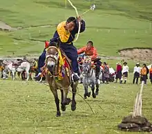 Le cheval au Tibet reste un animal de travail quotidien, mais il est aussi le support d'une multitude de pratiques traditionnelles, notamment l'archerie montée. Le cheval a une place dans les croyances du bouddhisme tibétain, à travers le cheval du vent et la pratique de l'hippomancie par le hennissement.