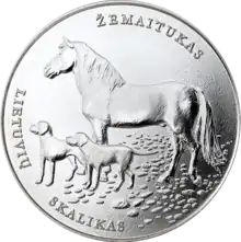 Les armoiries de la Lituanie comportent un soldat monté[17]. Le folklore narratif lituanien compte de nombreuses références au comportement du cheval, en particulier concernant ses réactions à un nouvel environnement : le cheval y est doué de prescience, et reflète la richesse de son propriétaire[18]. Le texte des chansons populaires poétiques lituaniennes donne le contexte social de leur époque, avec des références au cheval de travail, de selle, ou encore à la jument, avec une importance considérable de la symbolique du cheval[19].
