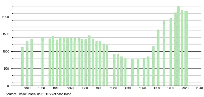 L'évolution du nombre d'habitants est connue à travers les recensements de la population effectués dans la commune depuis 1793. Pour les communes de moins de 10 000 habitants, une enquête de recensement portant sur toute la population est réalisée tous les cinq ans, les populations légales des années intermédiaires étant quant à elles estimées par interpolation ou extrapolation[24]. Pour la commune, le premier recensement exhaustif entrant dans le cadre du nouveau dispositif a été réalisé en 2005[25].