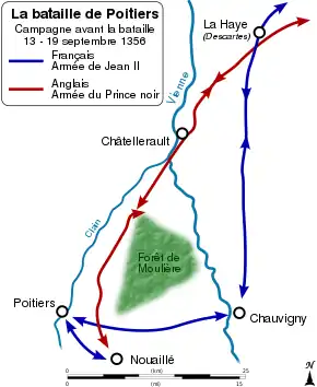 Au printemps 1356, le Prince Noir fait assembler à La Réole une force d'environ 9 000 hommes[Note 2]. Les Français en déduisent que le prince de Galles se prépare à rééditer sa chevauchée de l'automne 1355. Le roi de France, alors au siège de Breteuil, envoya des renforts afin de renforcer l’armée de Charles, alors comte de Poitiers, positionnée à Bourges et de l’expédier rapidement dans le sud de la France soutenir les possessions et villes du Languedoc.