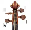 Les instruments à cordes frottées tels que le violon, l'alto ou le violoncelle ont le même type de cheville, une pièce de buis, de palissandre, d'ébène ou d'un autre bois dur homogène, qui se situe dans la tête (ou cheviller). Elle est une des extrémités de la corde, l'autre étant le tendeur au niveau du cordier. Elle est bloquée dans un des quatre orifices de la tête, perpendiculairement à l'axe de la touche.