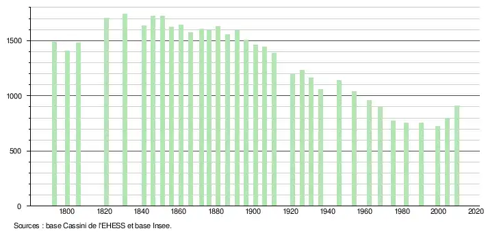 L'évolution du nombre d'habitants est connue à travers les recensements de la population effectués dans la commune depuis 1793. À partir du , les populations légales des communes sont publiées annuellement dans le cadre d'un recensement qui repose désormais sur une collecte d'information annuelle, concernant successivement tous les territoires communaux au cours d'une période de cinq ans. Pour les communes de moins de 10 000 habitants, une enquête de recensement portant sur toute la population est réalisée tous les cinq ans, les populations légales des années intermédiaires étant quant à elles estimées par interpolation ou extrapolation[33]. Pour la commune, le premier recensement exhaustif entrant dans le cadre du nouveau dispositif a été réalisé en 2004[34],[Note 1].