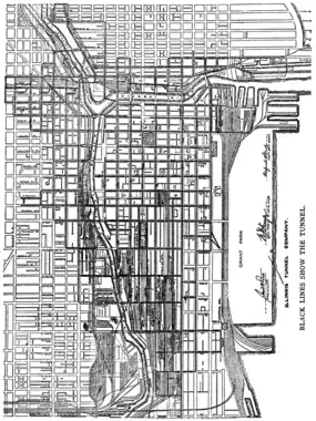En 1899, la ville de Chicago accorde à la nouvelle société Illinois Telephone and Telegraph Company le droit de construire des tunnels utilitaires sous les rues de Chicago afin d'y implanter son futur réseau de câbles téléphoniques. Les plans initiaux prévoient d'utiliser l'essentiel du volume de ces tunnels pour les câbles téléphoniques, laissant un passage de 6 pieds (1,83 m) sur 14 pouces (35,56 cm) pour l'entretien. La ville leur ayant refusé le droit de creuser des puits d'accès dans la chaussée à travers lesquels les câbles pourraient être déroulés dans les tunnels, les plans sont modifiés pour inclure des rails afin de transporter les bobines de câbles[3],[4],[5]. La ville n'est alors pas pleinement au courant de la nature du tunnel et les 16 premiers milles (25,750 km) de tunnel sont creusés de manière quelque peu clandestine, en travaillant depuis le sous-sol d'un saloon et en évacuant les déblais après minuit[6].