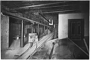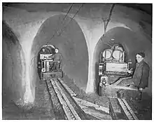 Les premiers trains d'essai à voie de 2 pieds circulent quelques années après le début de la construction. La majeure partie du système de tunnels est exploitée à l'aide de lignes aériennes (250 volts) et perche de contact pour l'alimentation électrique[50]. En 1903-1904, l'Illinois Telephone Construction Company a acheté 22 locomotives classe LM à General Electric d'un poids de 5 tonnes courtes 4,535 t avec deux moteurs de traction de 15 kW. L'essentiel de la traction dans les tunnels repose sur des locomotives de mine standard fabriquées par la Jeffrey Manufacturing Company (en). Celles-ci pèsent 6 tonnes courtes et possèdent deux moteurs de traction 13 kW chacun[12],[51],[52]. Commonwealth Edison fournit l'énergie électrique[53].