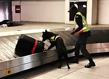 Chien de détection flairant un bagage dans un aéroport.
