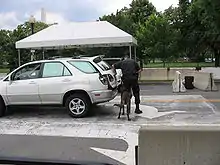 Un chien de détection se prépare à inspecter le coffre d'une voiture à Washington.