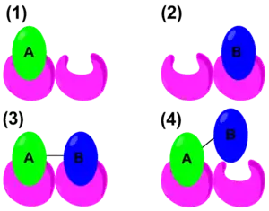 On considère que si est plus que la somme de et , alors il est positivement coopératif. Si est moins, alors il est négativement coopératif[16]. La chimie hôte-invité ne se limite pas aux interactions récepteur-ligand. Il est également démontré dans les systèmes d'appariement d'ions. Ces dernières années, de telles interactions sont étudiées dans un milieu aqueux utilisant des hôtes organométalliques et des molécules organiques hôtes. Par exemple, un récepteur poly-cationique contenant du cuivre (l'hôte) est coordonné avec des molécules telles que les tétracarboxylates, le tricarballate, l'aspartate et l'acétate (les invités). Cette étude illustre que l'entropie plutôt que l'enthalpie détermine l'énergie de liaison du système conduisant à une coopérativité négative. Le grand changement d'entropie provient du déplacement des molécules de solvant entourant le ligand et le récepteur. Lorsque plusieurs acétates se lient au récepteur, il libère plus de molécules d'eau dans l'environnement qu'un tétracarboxylate. Cela a conduit à une diminution de l'énergie libre, ce qui implique que le système coopère négativement[17]. Dans une étude similaire, utilisant du guanidinium et du Cu(II) et des invités polycarboxylates, il est démontré que le positif en coopération est largement déterminé par l'enthalpie[18]. En plus des études thermodynamiques, la chimie hôte-invité a également des applications biologiques.