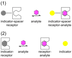 Traditionnellement, la détection chimique a été abordée avec un système qui contient un indicateur lié de manière covalente à un récepteur via un lieur. Une fois que l'analyte se lie, l'indicateur change de couleur ou devient fluorescent. Cette technique est appelée « approche indicateur-espaceur-récepteur » (ISR)[26]. Contrairement à l'ISR, le test de déplacement d'indicateur (IDA) utilise une interaction non-covalente entre un récepteur (l'hôte), un indicateur et un analyte (l'invité). Semblable à ISR, l'IDA utilise également des indicateurs colorés (C-IDA) et de fluorescence (F-IDA). Dans un test IDA, un récepteur est incubé avec l'indicateur. Lorsque l'analyte est ajouté au mélange, l'indicateur est rejeté dans l'environnement. Une fois que l'indicateur est relâché, il change de couleur (C-IDA) ou devient fluorescent (F-IDA)[27].