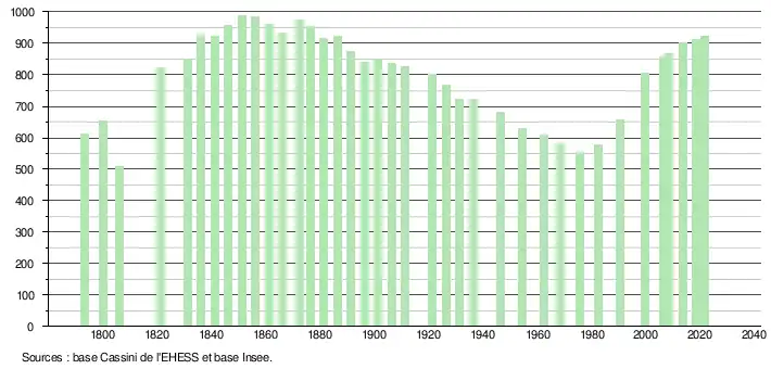 L'évolution du nombre d'habitants est connue à travers les recensements de la population effectués dans la commune depuis 1793. Pour les communes de moins de 10 000 habitants, une enquête de recensement portant sur toute la population est réalisée tous les cinq ans, les populations légales des années intermédiaires étant quant à elles estimées par interpolation ou extrapolation[25]. Pour la commune, le premier recensement exhaustif entrant dans le cadre du nouveau dispositif a été réalisé en 2008[26].