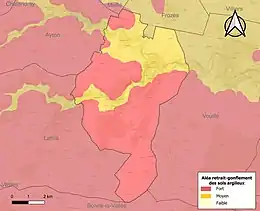 Les mouvements de terrains susceptibles de se produire sur la commune sont des affaissements et effondrements liés aux cavités souterraines (hors mines) et des tassements différentiels[19]. Afin de mieux appréhender le risque d’affaissement de terrain, un inventaire national permet de localiser les éventuelles cavités souterraines sur la commune[20]. Le retrait-gonflement des sols argileux est susceptible d'engendrer des dommages importants aux bâtiments en cas d’alternance de périodes de sécheresse et de pluie[21]. La totalité de la commune est en aléa moyen ou fort (79,5 % au niveau départemental et 48,5 % au niveau national)[Carte 2]. Depuis le , en application de la loi ÉLAN, différentes contraintes s'imposent aux vendeurs, maîtres d'ouvrages ou constructeurs de biens situés dans une zone classée en aléa moyen ou fort[Note 3],[22].