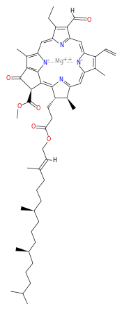 La chlorophylle b est une forme de chlorophylle de couleur vert olive qui absorbe essentiellement la lumière bleue et qui est davantage soluble en milieu aqueux que la chlorophylle a en raison de la présence d'un groupement carbonyle dans sa structure.