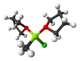 Le chlorure de méthylmagnésium est un composé chimique de formule CH3MgCl. Il s'agit d'un réactif de Grignard disponible dans le commerce, généralement dissous dans le tétrahydrofurane (THF) ; dans ce solvant, il se forme un complexe dans lequel l'atome de magnésium est lié par liaison covalente au groupe méthyle et au chlorure, et par coordination aux atomes d'oxygène de deux molécules de THF.