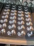 À gauche, un assemblage de chocolats moulés. À droite, un moule ancien pour la confection de sujets en forme de poule. | ||
