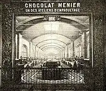 - Antoine Brutus Menier fonde en 1816 l’entreprise Menier. Celle-ci, installée à l’origine dans le quartier du Marais à Paris, commence par produire et vendre des produits pharmaceutiques[12]. La fabrique est créée quatre-vingt sept ans après la chocolaterie Pailhasson, la plus ancienne maison de chocolat de France[13],[14]. L'histoire de l'entreprise Menier est intimement liée à l'histoire de la ville de Noisiel, en Seine-et-Marne, où elle s'est installée à partir de 1825[12]. En 1867, Emile-Justin Menier, le fils d'Antoine, décide de recentrer l'usine sur la fabrication de chocolat[12]. C’est aussi le moment de l’essor de la production et des effectifs de l’entreprise, qui passent de 50 ouvriers en 1856 à plus de 320 en 1867, puis à plus de 2 000 en 1874[15]. L'usine fait construire de nombreux bâtiments, ainsi qu'une cité ouvrière, à l'image de leur concurrent anglais Cadbury. En 1893, la chocolaterie est consacrée plus grande entreprise de production de chocolat au monde[12]. Noisiel doit son industrialisation à l'installation de la chocolaterie, où travaille alors une grande partie de la population de la commune. Jusqu'à la Seconde Guerre mondiale, un Noisélien sur trois y travaille. La chocolaterie ne parvient cependant pas à faire face à la concurrence après la guerre, et la famille liquide l’entreprise en 1959[12]. Nestlé-France en devient propriétaire en 1988 et y installe son siège social en 1996[12].