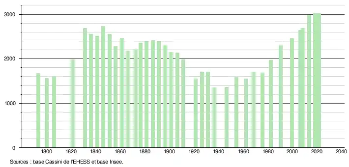 L'évolution du nombre d'habitants est connue à travers les recensements de la population effectués dans la commune depuis 1793. Pour les communes de moins de 10 000 habitants, une enquête de recensement portant sur toute la population est réalisée tous les cinq ans, les populations légales des années intermédiaires étant quant à elles estimées par interpolation ou extrapolation[20]. Pour la commune, le premier recensement exhaustif entrant dans le cadre du nouveau dispositif a été réalisé en 2008[21].