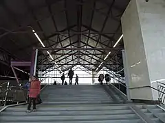 La station en surface est installée dans un bâtiment couvert, elle dispose d'un accès au centre des voies avec accès à une mezzanine en relation avec les quais latéraux par des escaliers fixes[2].