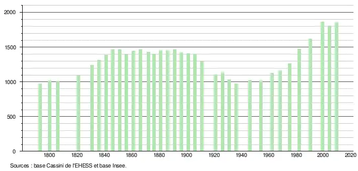 L'évolution du nombre d'habitants est connue à travers les recensements de la population effectués dans la commune depuis 1793. À partir du , les populations légales des communes sont publiées annuellement dans le cadre d'un recensement qui repose désormais sur une collecte d'information annuelle, concernant successivement tous les territoires communaux au cours d'une période de cinq ans. Pour les communes de moins de 10 000 habitants, une enquête de recensement portant sur toute la population est réalisée tous les cinq ans, les populations légales des années intermédiaires étant quant à elles estimées par interpolation ou extrapolation[15]. Pour la commune, le premier recensement exhaustif entrant dans le cadre du nouveau dispositif a été réalisé en 2004[16],[Note 1].