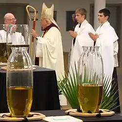 Le saint chrême est béni et consacré par l'évêque au cours de la messe chrismale, messe réunissant tous les prêtres d'un diocèse autour de leur évêque. Cette messe a lieu le Jeudi saint, mais elle peut être, et est souvent, déplacée au lundi, mardi ou mercredi de la Semaine sainte afin de pouvoir rassembler plus facilement les prêtres du diocèse.