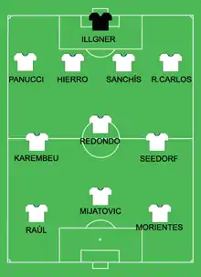 Aussi doté soit-il, ce titre ne règle pas les problèmes financiers dans lesquels se débat le club. L'ambiance est houleuse depuis que les experts comptables ont mis au jour une perte de plus de cent cinquante millions d'euros. Prestement débarqué, le président Lorenzo Sanz est remplacé en juillet par l'ambitieux Florentino Pérez. Pour redorer le blason du Real, ce dernier entreprend de moderniser les installations avec le nouveau complexe sportif de Valdebebas, et d'acheter des vedettes internationales. Cette politique de recrutement débute quelques mois auparavant avec la signature de Nicolas Anelka[k 41].