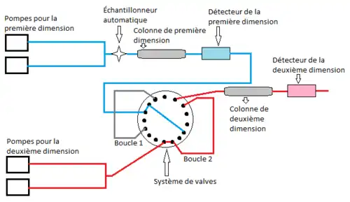 Les différentes parties d’un appareil pour la chromatographie bidimensionnelle est très similaire à la chromatographie en phase liquide monodimensionnelle. Il comprend un injecteur, deux colonnes, deux systèmes de valves, deux détecteurs et deux pompes de gradient servant à faire progresser l’éluant dans les colonnes[5].