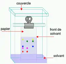 Le papier est ensuite trempé dans un solvant (éluant) comme un mélange eau/éthanol et placé dans un récipient fermé. Pendant que le solvant (éluant) monte le long du papier par capillarité, il rencontre l'échantillon et l'entraîne.