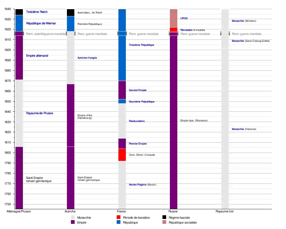 La frise chronologique suivante présente les différents régimes politiques de 1745 à la veille de la Seconde Guerre mondiale dans les plus puissants pays d'Europe de l'époque, à savoir l'Allemagne, l'Autriche, la France, le Royaume-Uni et la Russie.