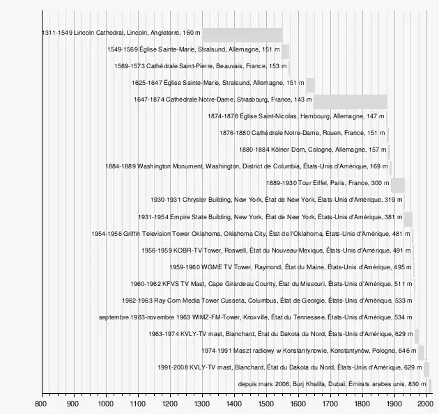 - 1310, Cathédrale de Lincoln, Angleterre, 160 mètres. Cette hauteur est toutefois très contestée par les historiens