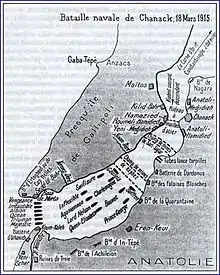 Plan de l'attaque navale franco-anglaise du 18 mars 1915 contre le détroit des Dardanelles.