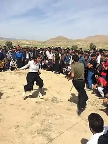 - La première, que l'on retrouve chez les tribus Lors[2] (en particulier Bakhtiaris), ainsi que chez les Kachkaïs, est un jeu qui a généralement lieu au début d'un mariage. Dans ce jeu accompagné de musique traditionnelle tochmāl (persan : تشمال, composée des instruments dohol et karnay), deux adversaires masculins s'affrontent à tour de rôle sur une chorégraphie improvisée, l'un avec un bâton court tarkeh (persan : ترکه) avec comme objectif d'atteindre l'adversaire en dessous des genoux et l'autre avec un bâton long derak (persan : درک) avec comme objectif de se protéger de l'attaque de son adversaire. Après chaque attaque, les rôles sont inversés et d'autres participants peuvent demander à entrer dans le jeu. En raison de la rapidité et la violence des coups portés ainsi que la rivalité entre les joueurs de différentes tribus qui viennent se mettre en avant lors des mariages, ce jeu est en général réservé à des joueurs expérimentés.
