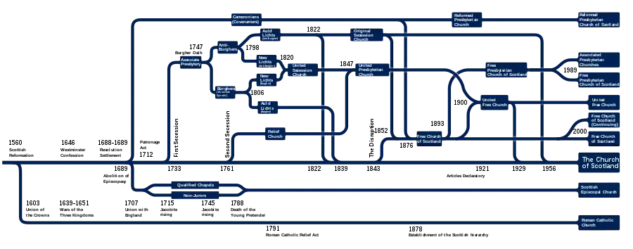 - Première sécession de l'Église d'Écosse (en) (1732-1733) : Associate Presbytery, United Secession Church (en)