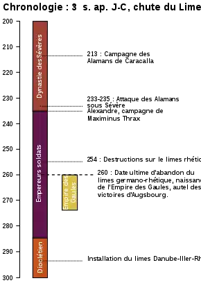 Une campagne de Caracalla en 213 a pu stabiliser la situation pour quelques années. Il est possible que ce fut le prétexte pour l'érection du monument triomphal du Limestor Dalkingen (de)[24]. Mais déjà, l'attaque des Alamans de 233 à 235 a eu des conséquences catastrophiques sur la zone frontière. Comme l'armée de Germanie supérieure avait mis à disposition ses unités les plus capables, notamment les unités de cavalerie (alae), pour la campagne de Perse de Sévère Alexandre, il semble qu'elle était arrivée à un état incapable de défense efficace. Ici, il convient de se rappeler que le limes n'était pas une fortification purement militaire, mais servait en premier lieu au contrôle du trafic des marchandises et des personnes.