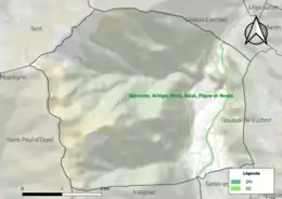 L'occupation des sols de la commune, telle qu'elle ressort de la base de données européenne d’occupation biophysique des sols Corine Land Cover (CLC), est marquée par l'importance des forêts et milieux semi-naturels (88,2 % en 2018), une proportion identique à celle de 1990 (88,2 %). La répartition détaillée en 2018 est la suivante : forêts (69,8 %), milieux à végétation arbustive et/ou herbacée (18,4 %), prairies (9,4 %), zones urbanisées (2,4 %)[29]. L'évolution de l’occupation des sols de la commune et de ses infrastructures peut être observée sur les différentes représentations cartographiques du territoire : la carte de Cassini (XVIIIe siècle), la carte d'état-major (1820-1866) et les cartes ou photos aériennes de l'IGN pour la période actuelle (1950 à aujourd'hui)[Carte 2].