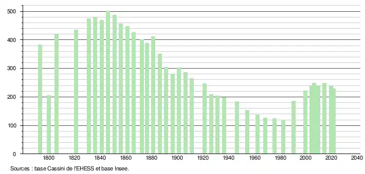 | L'évolution du nombre d'habitants est connue à travers les recensements de la population effectués dans la commune depuis 1793. Pour les communes de moins de 10 000 habitants, une enquête de recensement portant sur toute la population est réalisée tous les cinq ans, les populations légales des années intermédiaires étant quant à elles estimées par interpolation ou extrapolation[43]. Pour la commune, le premier recensement exhaustif entrant dans le cadre du nouveau dispositif a été réalisé en 2004[44]. En 2021, la commune comptait 229 habitants[Note 7], en diminution de 8,4 % par rapport à 2015 (Haute-Garonne : +7,43 %, France hors Mayotte : +1,84 %). |