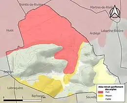 Le retrait-gonflement des sols argileux est susceptible d'engendrer des dommages importants aux bâtiments en cas d’alternance de périodes de sécheresse et de pluie. 46,5 % de la superficie communale est en aléa moyen ou fort (88,8 % au niveau départemental et 48,5 % au niveau national). Sur les 169 bâtiments dénombrés sur la commune en 2019, 169 sont en aléa moyen ou fort, soit 100 %, à comparer aux 98 % au niveau départemental et 54 % au niveau national. Une cartographie de l'exposition du territoire national au retrait gonflement des sols argileux est disponible sur le site du BRGM[29],[Carte 3].