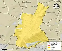 Le retrait-gonflement des sols argileux est susceptible d'engendrer des dommages importants aux bâtiments en cas d’alternance de périodes de sécheresse et de pluie. 93,3 % de la superficie communale est en aléa moyen ou fort (44,5 % au niveau départemental et 48,5 % au niveau national). Sur les 324 bâtiments dénombrés sur la commune en 2019, 324 sont en aléa moyen ou fort, soit 100 %, à comparer aux 75 % au niveau départemental et 54 % au niveau national. Une cartographie de l'exposition du territoire national au retrait gonflement des sols argileux est disponible sur le site du BRGM[37],[Carte 3].