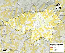 Le retrait-gonflement des sols argileux est susceptible d'engendrer des dommages importants aux bâtiments en cas d’alternance de périodes de sécheresse et de pluie[17]. 38,7 % de la superficie communale est en aléa moyen ou fort (27 % au niveau départemental et 48,5 % au niveau national métropolitain)[Carte 2]. Depuis le , en application de la loi ÉLAN, différentes contraintes s'imposent aux vendeurs, maîtres d'ouvrages ou constructeurs de biens situés dans une zone classée en aléa moyen ou fort[Note 4],[18].